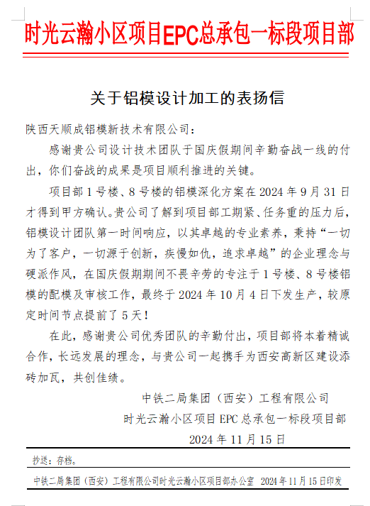 2024我們凝心聚力,篤行實(shí)干,品質(zhì)服務(wù)不斷提升。江蘇天利成承接南京綠城G55項(xiàng)目鋁合金模板供應(yīng)成功舉辦觀摩會(huì),時(shí)光云瀚小區(qū)8#項(xiàng)目服務(wù)質(zhì)量高,榮獲客戶高度好評(píng)并贈(zèng)送錦旗。在此,感謝所有客戶給予天利成支持和信任!