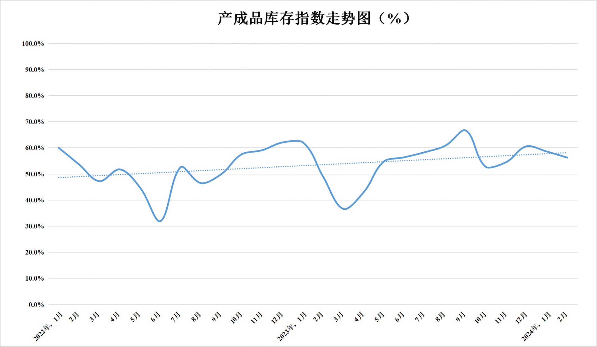 產(chǎn)成品庫存指數(shù)為56.3%,較上月下降2.3個百分點,高于臨界點,表明產(chǎn)品庫存較上月下降。